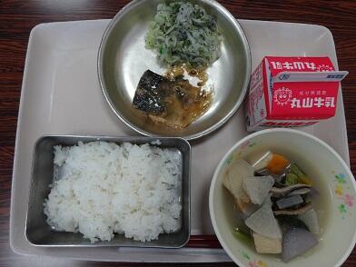 【ごはん 牛乳 サバのゆず味噌煮 添え野菜 けんちん汁】