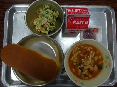 今日はイタリアの家庭料理「ミネストローネ」でした。主にトマトを使ったイタリアの野菜スープですが、イタリアでは、使う野菜も季節や地方によって様々で、決まったレシピはないようです。トマトを入れていないものでも「ミネストローネ」と呼ばれることがあるようです。パンとスープとサラダ、そして牛乳とバランスのとれたメニューでした。ごちそうさまでした。