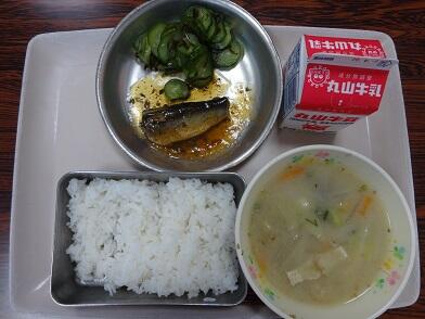 【ごはん 牛乳 いわしの梅煮 添え野菜 ごま味噌汁】
