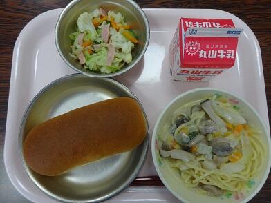 今日は代筆です。一年中おいしいパスタですが、濃厚な熱々のクリームソースとなると冬がうれしいです。鶏肉ときのこがたっぷり入っていて、このボリューム。給食は本当に驚くべきコストパフォーマンスです。さっぱり味のサラダが、とてもよいアクセントになっていました。ごちそうさまでした。