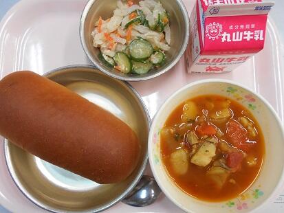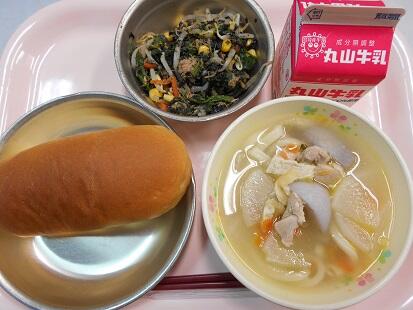 「今日の給食は香川県の郷土料理「しっぽくうどん」です。しっぽくうどんは、吹く風が冷たくなり始める、秋口から冬にかけてのうどんの食べ方です。 讃岐の冬の代表的な郷土料理です。 数種類の季節の野菜を、汁とともに煮込む方法で、ゆでたうどんの上から共に煮た野菜をかけたものでず。 年末には年越しそばの代わりに食べる家庭もあるそうです。」一口メモより