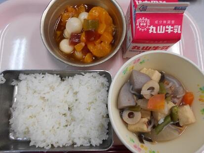 『給食では、栄養のことだけでなく、県外の代表的な食文化につても学んでほしいと考えています。今日の給食は、埼玉県の郷土料理「ことじ」を紹介しています。山でとれる里いもやにんじん、そして海の幸で保存のできる、けんさきイカなどを取り入れた具だくさんの汁煮物です。地域によって「こづゆ」「つゆにしめ」とも呼ばれているそうです。』一口メモより