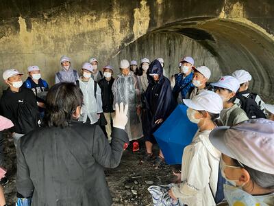 雨が強く降り始めましたが、傘をさしたりカッパを着たりして戦争や平和について学習しました。掩体壕(えんたいごう・・・軍用機を敵の空襲から守るための施設)は、同年代の子どもも造るのに協力したそうです。