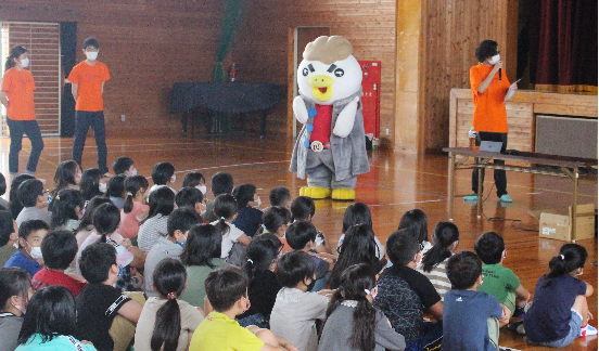 7月8日(木)、3年生の「延岡の素敵なところをみつける」学習にチキナン番長さんが来てくれました。5校時にチキン南蛮党の皆さんから延岡の素敵なところを紹介していただき、給食時間には、チキナン番長さんが全学年を回ってくれました。