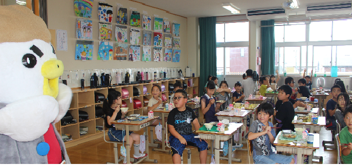 子どもたちは、給食のチキン南蛮を食べながら、訪問したチキナン番長さんに手を振って喜んでいました。