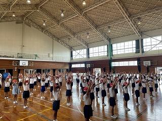 2年生は雨のため、体育館で体育です。まずは準備運動。そのあと団技練習をしていました。