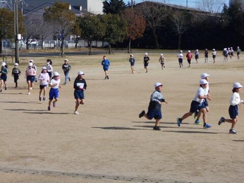 BGMにのって一生懸命持久走に取り組む5年生たち。