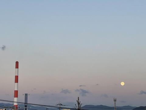 朝学校に来ると、東にきれいな朝日と、西にしずむ満月が見えました。
