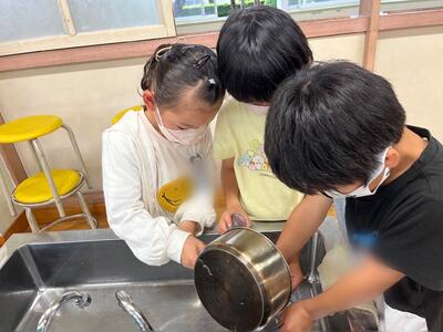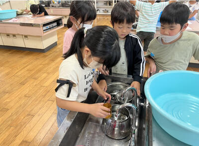 2年生の算数の授業です。やかんと鍋にどれくらいの水が入るのかを予想し、1Ⅼマス等を使って量を測りました。
