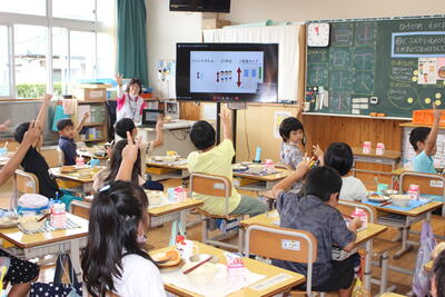 写真に写っているのは延岡市ALTのチャック・シオン先生です。各クラス、月に2回ほど、高学年を中心に子どもたちの外国語をサポートしてくださいます。