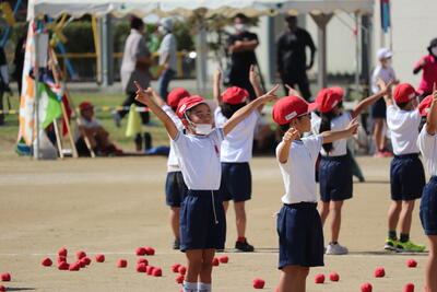 低学年は、表現を取り入れた団技です。2年生は大玉転がしの冒頭に、某テーマパークで話題の「ジャンボリミッキー!」をかわいらしく踊りました。玉転がしでは、行き過ぎたり、大玉に弾かれて尻もちをついたりする様子も見られましたっが、それも本競技の醍醐味ですね。