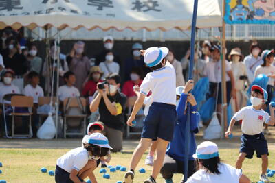 1年生の団技は玉入れです。皆さんご存じのとおり、円の中に敷き詰めたおじゃみを中央のかごの中に入れる競技です。密になるのを避けるため、半数ずつ交代で投げる工夫が見られました。