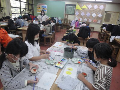 10月26日(水)、東幼稚園の年長クラス(すみれ組)で体験研修を実施させていただきました。写真は、ハロウィンのお面作りを行っている様子です。(お面をつけているのは、山本教諭ではなく、すみれ組担任のまなつ先生です)遊びをとおして多くを学ぶ幼児の姿から、学校教育でも育むべき資質・能力について、改めて考えることができました。幼児教育で培われた学びのバトンを、小学校で円滑に引き継ぎたいと思います。