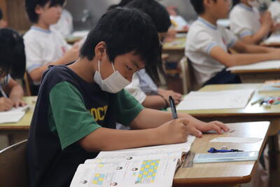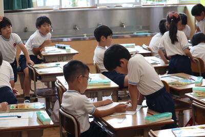 6月14日(水)、3年1組で書写(毛筆)の授業が行われていました。大型ディスプレイにお手本動画を示しつつ、担任が実際に筆で書き示すハイブリッド型?の指導が行われていました。様々な手立てでインプットすることで、子どもたちにも分かりやすく筆づかいなどが伝わったようです。3年生から始まった毛筆の授業ですが、少しずつ筆の扱いにも慣れてきたようです。