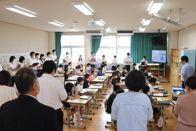 改めて2か月を振り返るとともに、今後のやる気が高まったように感じました。最後は、全校児童の校歌の歌声が体育館に響き渡りました。