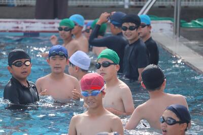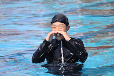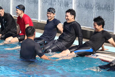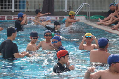 水慣れや呼吸、バタ足やかえる足の指導方法、ビート板を使った平泳ぎ、クロールへの段階的指導方法などを教えていただきました。改めて、段階的・系統的な指導が重要であることを実感しました。東っ子が、楽しみながら水に慣れ、泳力を身に付けることができるよう、安全な指導を心がけていきます。年永先生、ありがとうございました。