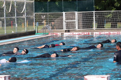 6月22日(木)、スーパーサーズデイの放課後、来週からはじまる水泳指導に向けて体育実技研修を行いました。「体育振興指導教員等による小学校派遣事業」を活用し、体育振興指導教員である宮崎市立東小学校の年永健二先生を講師に招いての研修でした。はじめに体育館で講義を受けた後、プールで実技講習を実施しました。