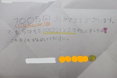 6月23日(金)、ホームページ管理者の机に手紙がありました。中身を見ると、先日閲覧数「100万」を達成したことに対するお祝いのメッセージでした。ありがたいことに、たくさんの子どもたちも楽しみに見てくれているようです。