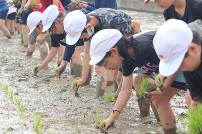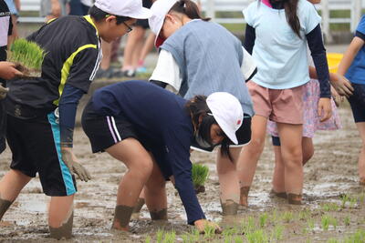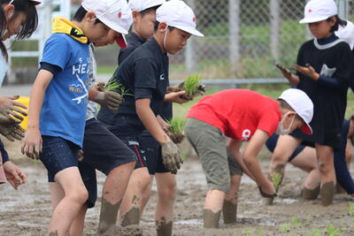 6月26日(月)、5年生が総合的な学習の時間において取り組むお米学習の田植え体験を行いました。今年度も、学校支援者の濱田さまの田んぼをお借りしての活動となります。