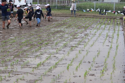 多くの子どもたちが初めての体験で、最初のうちは足にまとわりつく泥の感触に悲鳴に近いような声も聞かれましたが、慣れるに従って要領を得て、手植えを進めることができました。12月には収穫したもち米でもちつきを行う予定です。ご指導いただきました濱田さま、寺田さま、見守りいただいた保護者の皆さん、ありがとうございました。