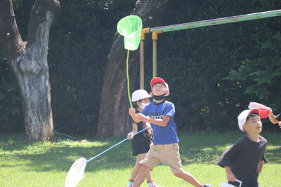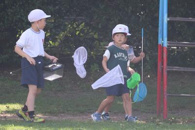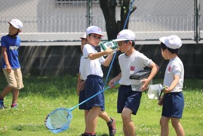 6月27日(火)、2年生が生活科「みんな生きている」の学習で、校庭の生き物探しをしていました。虫かごと虫取り網を手に、飛んでいるトンボを追いかけたり、草むらに潜んでいるバッタを探したりしていました。素早い虫の動きに四苦八苦している様子も見られました。目当ての虫を捕まえることはできたかな?