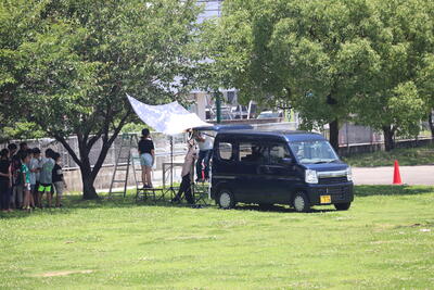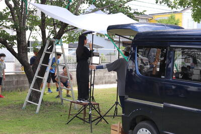 まだ6月ではありますが、卒業アルバムの個人写真などの撮影が始まっているようです。運動場の木陰に、屋外撮影スタジオ?が設置されていました。さすがはプロのカメラマン、リングライトやレフ板、木漏れ日を遮るシートなども設置され本格的です。どのような写真になるかは、できあがりをお楽しみに
