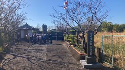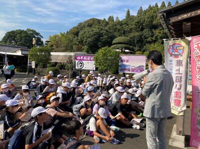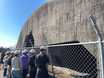 旧海軍航空隊宮崎基地跡に到着しました。宮崎空港が近いため、飛び立つ飛行機を間近で見ることができました。その後ガイドさんの説明を聞きながら、掩体壕を見学しました。掩体壕とは、軍用機などの装備・物資や人員を、敵の攻撃から守るためにコンクリートなどで造った横穴状の施設です。この周辺には、50基の掩体壕が作られたそうです。子どもたちは、真剣な眼差しで、戦争の悲惨さを感じているようです。
