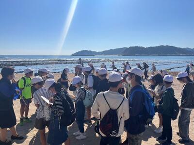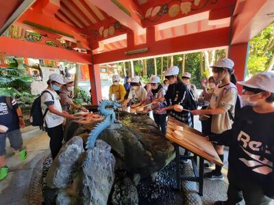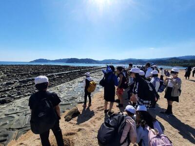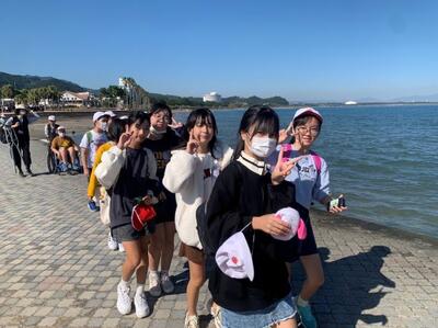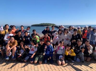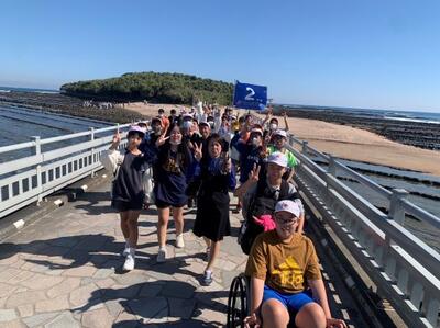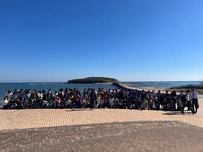 青島に到着しました。ここでは、学級や学年での記念撮影を行います。とても天気がよく、爽やかな海風が心地よいようです。宮崎のよさを全身で感じ取っています。みんないい表情で写っていますね。この後は、2クラスずつに分かれて、青島神社散策と買い物です。