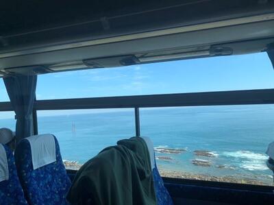 日南、飫肥城下町への移動中、堀切峠を通過しました。眼下に広がる海のパノラマに、自然と歓声があがったそうです。本日は、晴れ渡っているため、海の青さも一層映えていることでしょう。