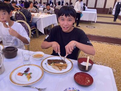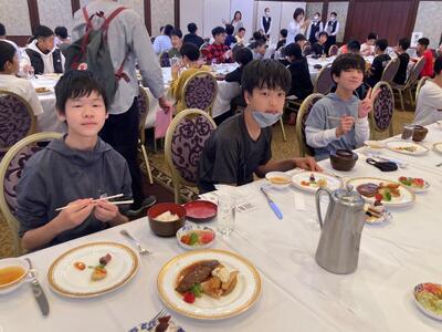 天井のシャンデリアにも負けないほどの、学年主任の輝く笑顔からも分かるように、順調に朝食が始まりました。今日1日を乗り切るために、しっかりと栄養を蓄えてくださいね。食後に「普段よりたくさん食べられました」と教えてくれる子が多くいました。椅子を入れたり、ゴミを拾ったりと場を整える姿も見られ、すがすがしい気持ちになりました。