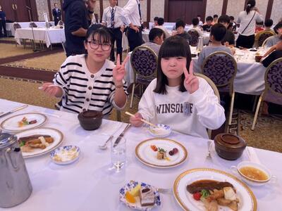 夕食は大広間でのフォーマルな形式でした。あれだけ食べ歩いたはずなのに、最初に並んでいた前菜を前に「え!これだけ?」と心配する声が聞こえたとか、聞こえないとか あまり使い慣れにフォークとナイフ