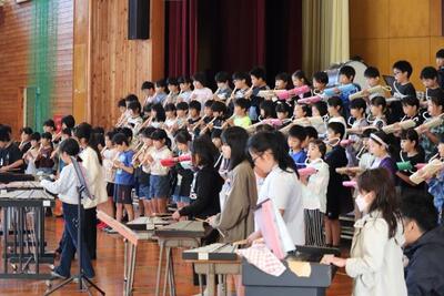 11月8日(水)、4年生が「延岡市小中学校音楽祭」で発表する合唱・合奏曲を、リハーサルを兼ねて、全校児童の前で披露しました。合奏「いつだって!」では、澄んだ歌声が響き渡りました。堂々としたソロパートも印象的でした。合奏「笑ってたいんだ」では、互いの音を聴き合いながらリズムを刻んでいました。