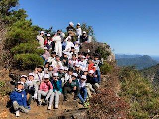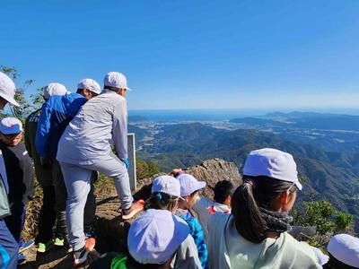 山頂に到着しました。これまでの疲れが吹っ飛ぶくらいの絶景でした。澄み切った晴天のため、延岡市や日向市はもちろん、四国まで見通すことができました。恒例のヤッホーコール!青少年自然の家のテラスからのコールもしっかりと聞こえました。山頂からの景色は、一生ものの宝物です