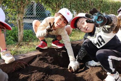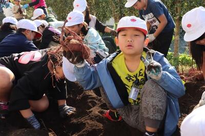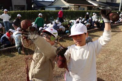 11月17日(金)、2年生が生活科の時間に、5月末に植えたサツマイモの収穫を行いました。大小さまざまな形のおいもを掘り、満足気な表情の2年生でした。
