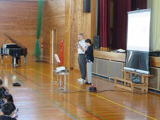 濵砂校長先生と5年担任の國武先生のリコーダーと養護教諭の大迫先生のピアノのアンサンブルで、曲は「ラ・ゴロンドリーナ(つばめ)」でした。導入で、ツバメの巣作りの動画を見ました。1年生の子どもたちから「わあ!すごい!」「どろや草で巣をつくっているっちゃ!」などの素直な驚きの声が聞こえてくるのが印象的でした。