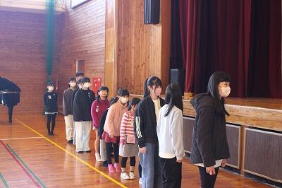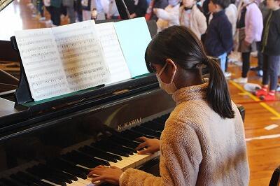 【ピアノ伴奏にあわせて校歌を歌う子ども達】