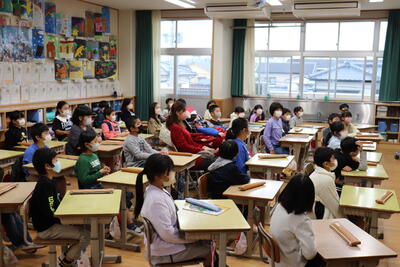 11月18日(金)、延岡しろやま支援学校3年生のKくんが、居住地校交流として3年1組に来てくれました。Kくんに音楽のプレゼントをした後、Kくんクイズ、東小クイズで盛り上がりました。