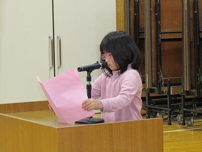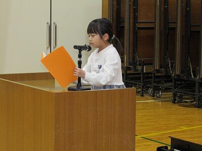 12月24日に、2学期の終業式を行いました。意見発表では、2年生と3年生の子どもが2学期に頑張ったことを発表しました。2年生の子どもは、かけ算、国語の教科書を読むことを頑張りました。3年生の子どもは、運動会のリーダーを務めたことや、遠足で学んだことを発表しました。