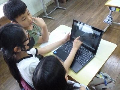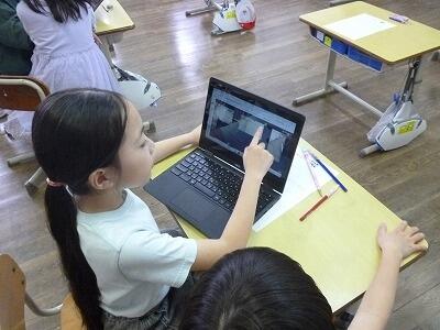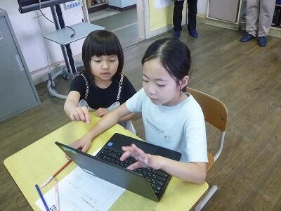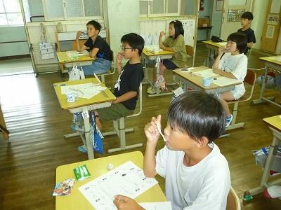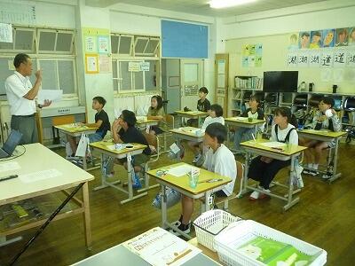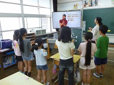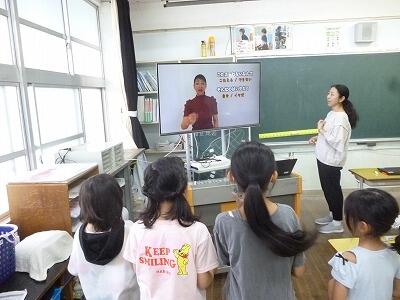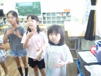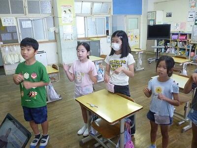 3・4年生の総合的な学習の時間の授業の様子です。福祉について、学んでいます。「アンパンマンのマーチ」を手話をしながら歌う練習をしていました。
