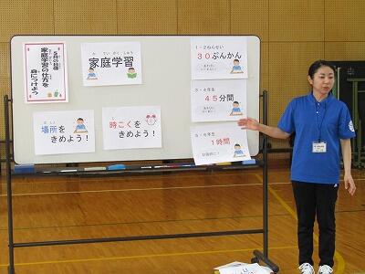 5月2日に、全校集会を行いました。5月の目標である「家庭学習の仕方を身につけよう」に関する指導を行いました。具体的には、家庭学習をする場所や時刻を決めることや、各学年ごとに設定している家庭学習の目安の時間を確認しました。その後、縦割り班に分かれ、自分達が頑張ることを決めました。