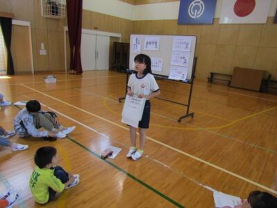 4月18日の業間の時間に、こども集会を行いました。内容は、各委員会からのお知らせです。方財小学校では、4~6年生の子ども達で委員会活動を行います。