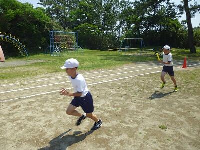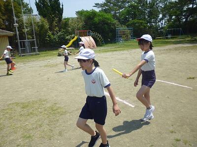 5・6年生の体育の授業の様子です。バトンパスの練習をしていました。2人で、「ハイッ!」「ハイッ!」と声を掛け合いながら、何度も繰り返していました。