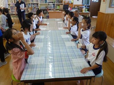 5月15日に、フッ化物洗口の練習をしました。全体説明の後、コップの水を口に含み、音楽に合わせてブクブクうがいをしました。誤って飲み込んでしまわないように、うつむいた状態でうがいをします。