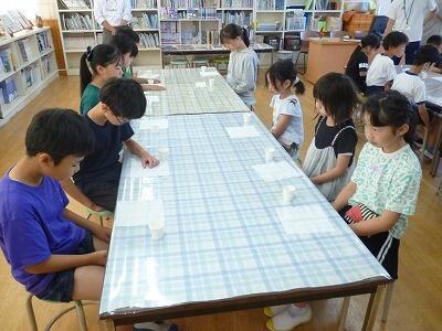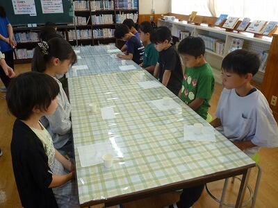 フッ化物洗口は、毎週木曜日の朝、図書室に集まって実施します。