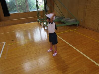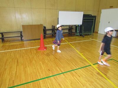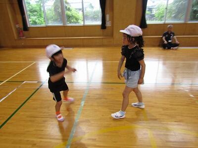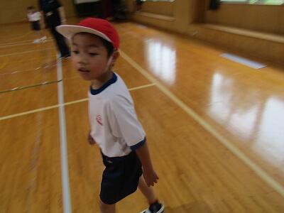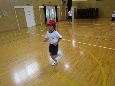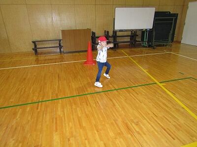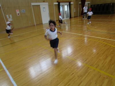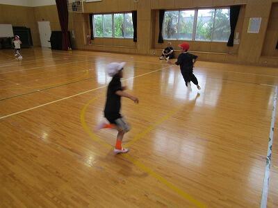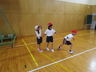 1・2年生の体育の授業の様子です。雨が降っていましたので、体育館で体つくりの運動(バナナ鬼)をしていました。相手チームにタッチされると、両腕を上げてバナナになります。仲間二人にタッチしてもらえば、再びゲームに参加できます。