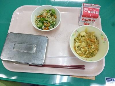 6月9日の給食のメニューは、カレー麻婆豆腐とチンゲン菜のナムルでした。麻婆豆腐にカレー味…。これが結構合うんです。とてもおいしくいただきました。