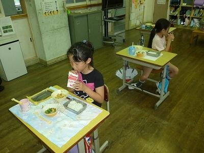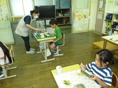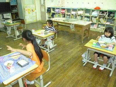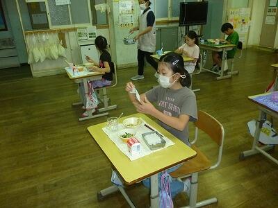 4月16日から、1年生の給食が始まりました。この日のメニューは、カレーライス、フルーツカクテルでした。栄養バランスばっちりの給食を食べて、大きく成長してほしいと思います。