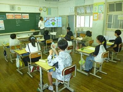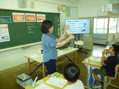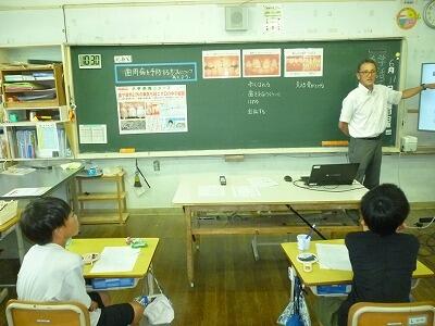 5・6年生の学級活動の授業の様子です。歯周病の予防について学びました。後半は、養護教諭の指導で、歯磨きの仕方の練習も行いました。