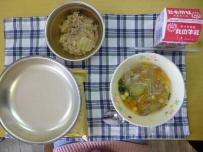 2月2日の給食は、マーボー白菜丼とマロニースープでした。