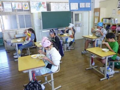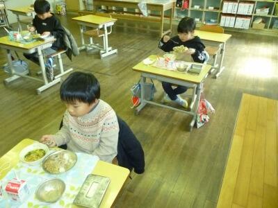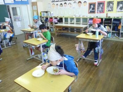 2年生の給食の様子を紹介します。2年生は、いつも自分の量の給食を全員完食しています。「感謝して食べる」気持ちが身に付いていますね。